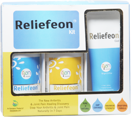 Duplex board box of Reliefeon Kit contains (1) Reliefeon 30 capsules (2) Reliefeon 30 Tablets (3) Reliefeon Gel 50 gm.